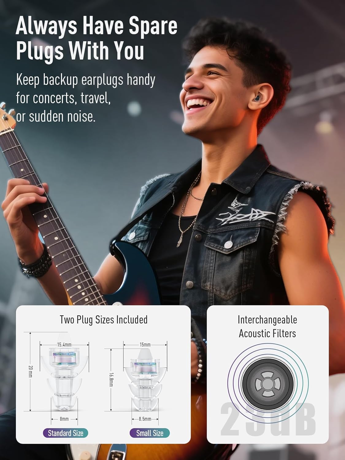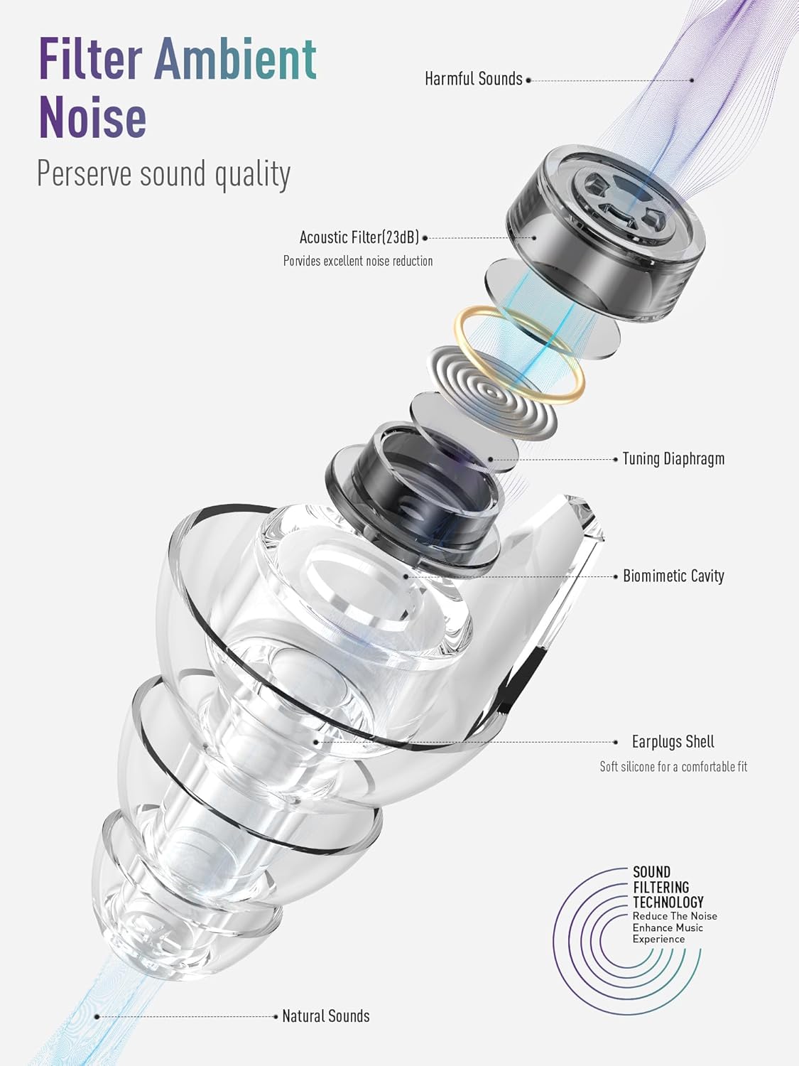[23dB Noise Reduction] Comes with 2 sets of different size ear plugs (small & standard) and 2 sets 23dB attenuation filters, you can choose the right fit for ear protection. Featuring three-flange ergonomic design, these noise reduction ear plugs specifically shaped to fit snugly into your ear canal, creating a secure seal that effectively blocks out unwanted noise.